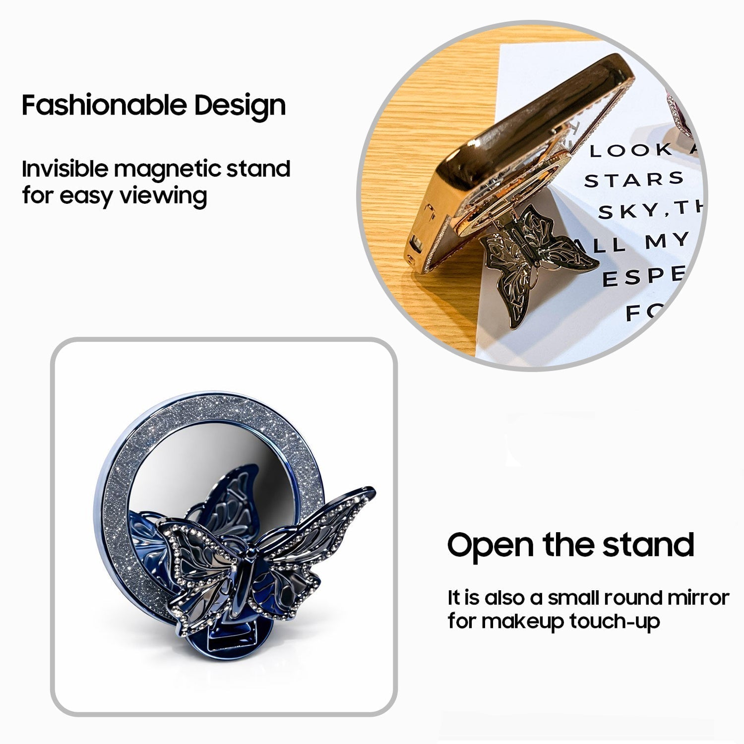 - Finishing : Glossy transparent back & Decorative metallic butterfly ring